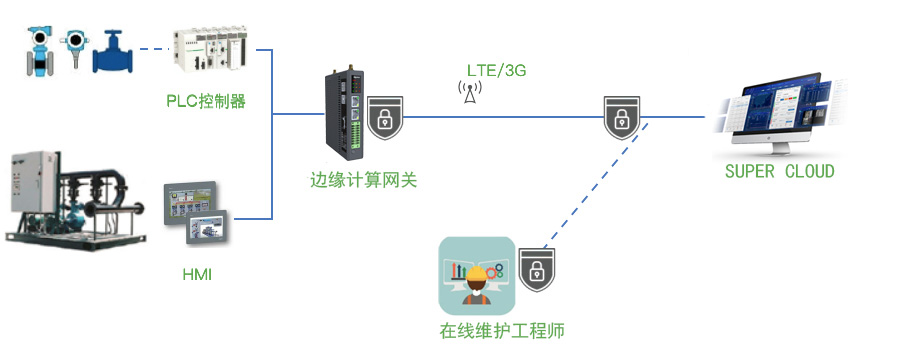 石油井口開采生產(chǎn)現(xiàn)場(chǎng)的PLC、HMI等智能設(shè)備通過以太網(wǎng)連接邊緣計(jì)算網(wǎng)關(guān),并且可以通過4G蜂窩網(wǎng)絡(luò)或者WIFI接入至華辰智通提供的思普云平臺(tái),為維護(hù)人員提供快速便捷安全的維護(hù)隧道。