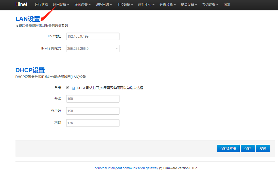 2. 網(wǎng)關(guān)LAN口IP與PLC的IP是否在同一網(wǎng)段,進(jìn)網(wǎng)關(guān)后臺,點(diǎn)擊“通訊設(shè)置 - LAN設(shè)置”,修改網(wǎng)關(guān)LAN口IP,使其與PLC的IP處于同網(wǎng)段。